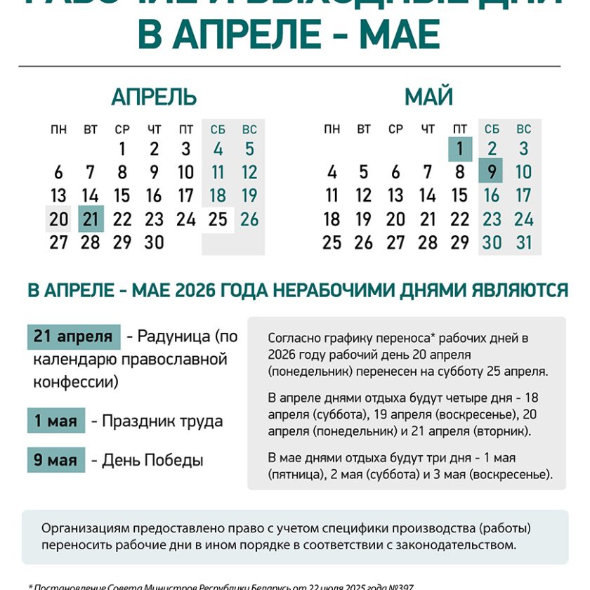 Согласно графику переноса* рабочих дней в 2026 году рабочий день 20 апреля (понедельник) перенесен на субботу 25 апреля.