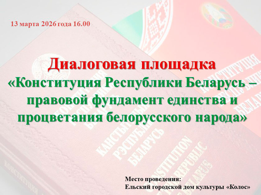 13 марта 2026 года в 16:00 в Ельском городском доме культуры «Колос» состоится – диалоговая площадка: «Конституция Республики Беларусь – правовой фундамент единства и процветания белорусского народа»
