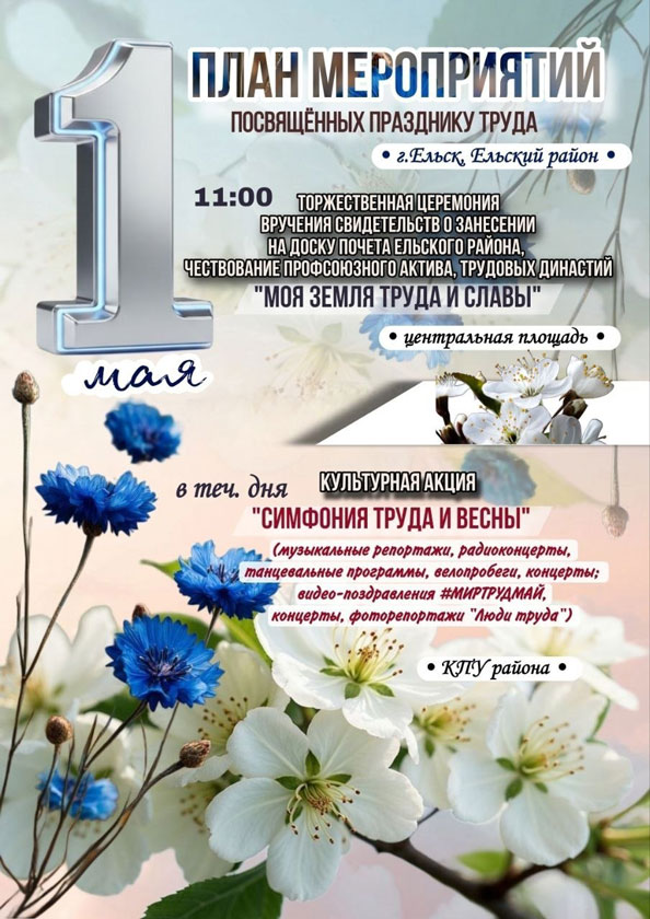 Анонс мероприятий, посвящённых Празднику труда, которые пройдут в Ельском районе 1 мая 2026 года