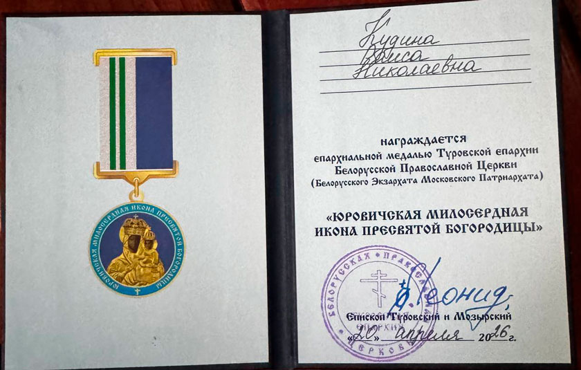 Во время торжественного богослужения в храме Святой Живоначальной Троицы города Ельска, приуроченного к празднованию обретения чудотворной Васьковской иконы Божией Матери, епископ Туровский и Мозырский Леонид вручил высокую церковную награду Раисе Николаевне Кудиной. За многолетние усердные труды во славу Церкви она была удостоена епархиальной медали Туровской епархии — «Юровичская Милосердная икона Пресвятой Богородицы».
