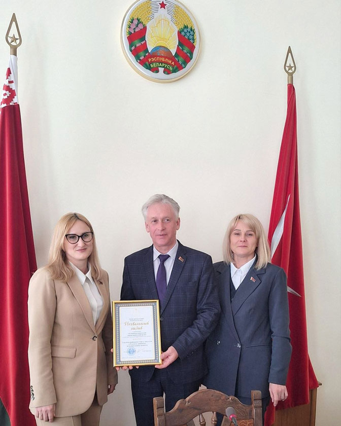 Наталья Николаевна вручила Похвальный отзыв Министерства юстиции Республики Беларусь Виктору Замостику, председателю Ельского районного исполнительного комитета, и Оксане Захарченко, председателю Ельского районного Совета депутатов.