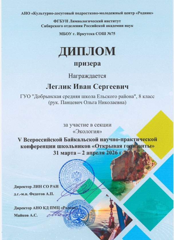 Учащийся Добрынской средней школы Леглик Иван стал призером Всероссийской Балтийской научно-практической конференции школьников с международным участием «Открывая горизонты».
